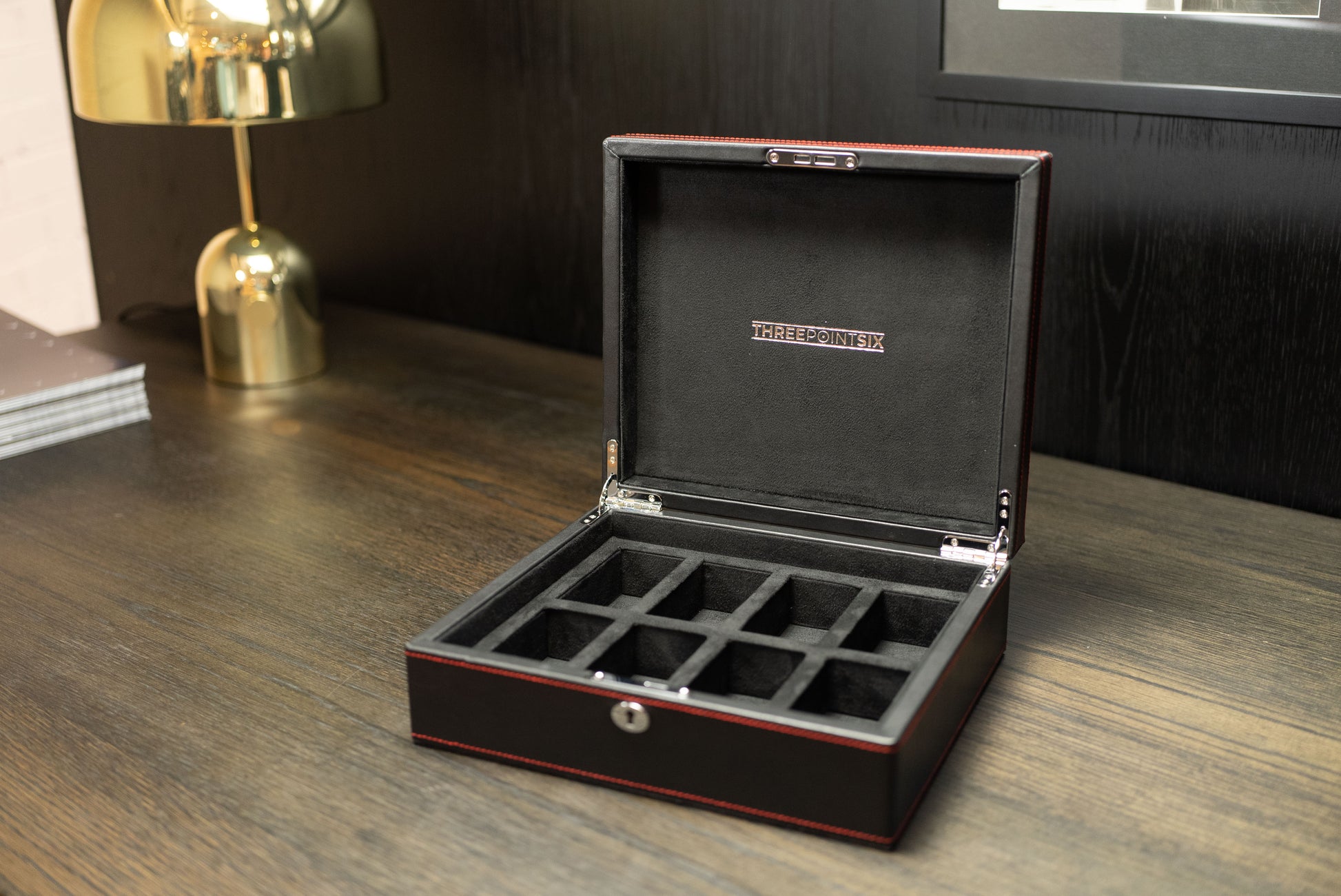 Designed to last, the storage box is crafted in a soft to touch leather with each compartment carefully lined in suede and finished with chrome hardware.